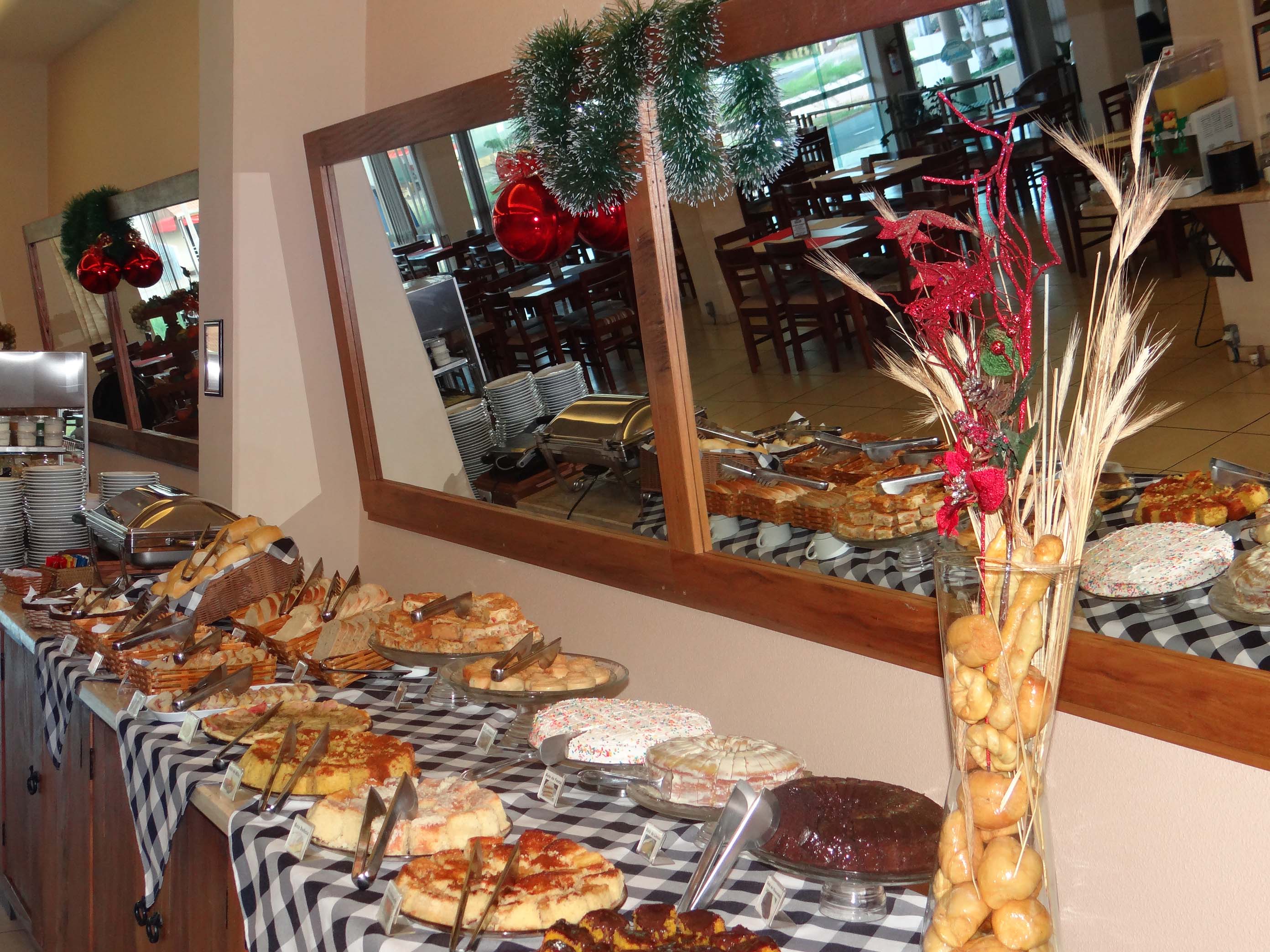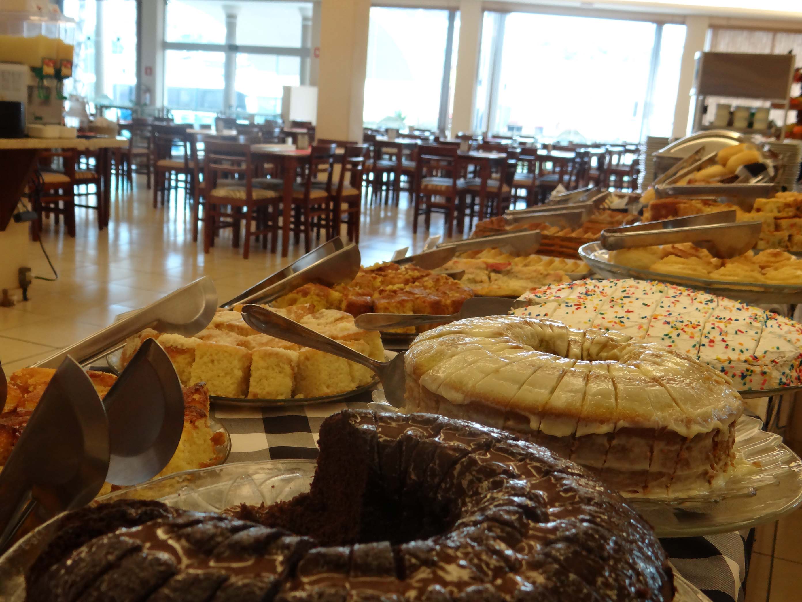 Café da Manhã, servido das 7:30h às 10h, com mais de 50 itens, sendo feitos em nossa cozinha, variados pães (salgado e doce), bolos, torta salgada, pizza, roscas, bolacha, pão de queijo, torrada, laticínios, sucos, frutas, leite(quente e frio), café, iogurte, salada de frutas, gelatina, cereais, granola, geleias, ovos mexidos, salsicha, entre outros...
